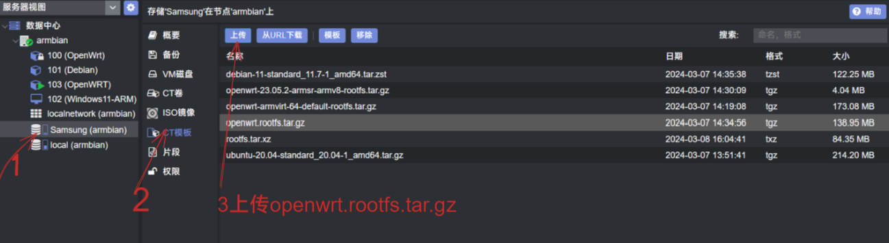 上传rootfs至PVE-CT模板(Samsung为我挂载的磁盘,你可上传至locla)