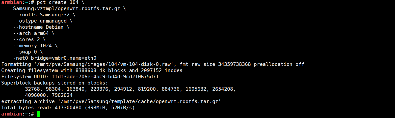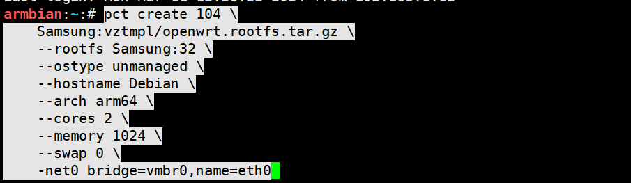 pct create 102 Samsung:vztmpl/openwrt.rootfs.tar.gz --rootfs Samsung:32 --ostype unmanaged --hostname OpenWRT --arch arm64 --cores 2 --memory 1024 --swap 512 -net0 bridge=vmbr0,name=eth0